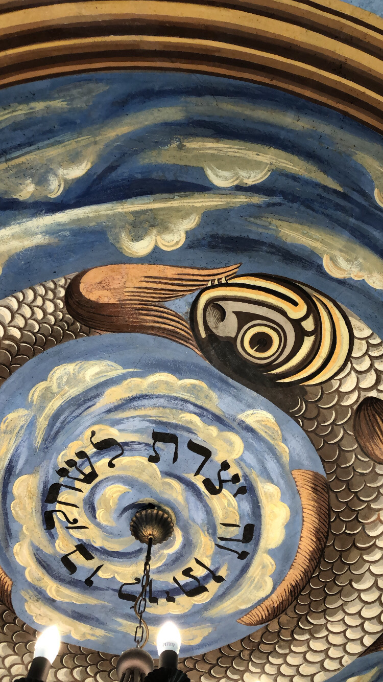Wersety modlitw były wypisane na ścianach. Sufit był pomalowany na kolor jasnoniebieski ze świecącymi, porozrzucanymi wokół gwiazdami. Pośrodku znajdowało się niebieskie koło, a w nim wielki wieloryb trzymający swój ogon w szczękach. Z centrum sufitu zwisała pięknie ozdobiona mosiężna lampa z zaświeconymi świecami, która zachwycała wszystkich przybyłych. Rodzice mieli zwyczaj straszenia dzieci następującą opowiastką: jeśli wieloryb wypuściłby ogon z paszczy, świat zostałby zalany i cały popadłby w ruinę.