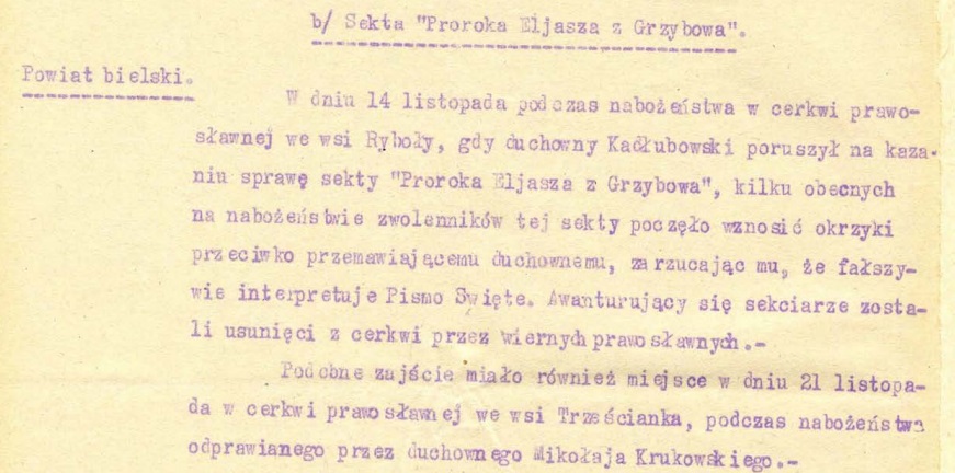 Według „Miesięcznych sprawozdań sytuacyjnych wojewody białostockiego za 1933 rok”, 14 listopada tegoż roku w pobliskiej miejscowości Ryboły, gdy duchowny Kadłubowski poruszył na kazaniu sprawę sekty „Proroka Eljasza z Grzybowa”, kilku obecnych na nabożeństwie zwolenników tej sekty poczęło wznosić okrzyki przeciwko przemawiającemu duchownemu, zarzucając mu, że fałszywie interpretuje Pismo Święte. Awanturujący się sekciarze zostali usunięci z cerkwi przez wiernych prawosławnych. Podobne zajście miało również miejsce w dniu 21 listopada w cerkwi prawosławnej we wsi Trześcianka, podczas nabożeństwa odprawianego przez duchownego Mikołaja Krukowskiego.