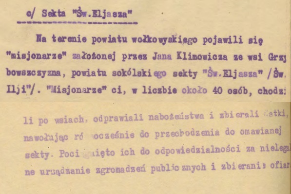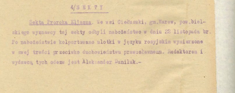 W tych samych sprawozdaniach dwa lata później odnotowano akcję propagatorską na rzecz sekty proroka Eliasza prowadzoną przez Sawatija Sawozuka z pobliskiej wsi Ciełuszki. Z kolei w 1936 roku w Ciełuszkach sekciarze odbyli nabożeństwo, po którym kolportowano ulotki w języku rosyjskim wymierzone w swej treści przeciwko duchowieństwu prawosławnemu.