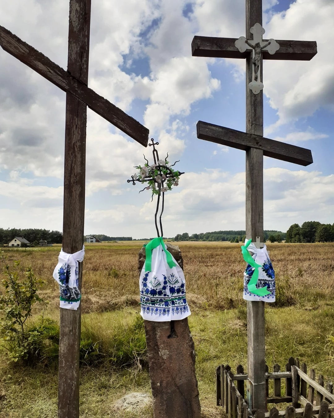 Gdzie jest krzyż? Podczas mojej wyprawy do Wierszalina w lutym 2025 roku postawiłam sobie za cel odszukanie go. Obejrzałam wszystkie oznaczone na Google Maps krzyże w okolicy, ale żaden z nich nie pasował do opisu. Jedynie ten, który stoi wbity przy cerkwi w Starej Grzybowszczyźnie, zdaje się być z nim zgodnym. Niestety nie mam pewności co do jego autentyczności, ale klimat Podlasia pozwala mi identyfikować się jako święta Helena.